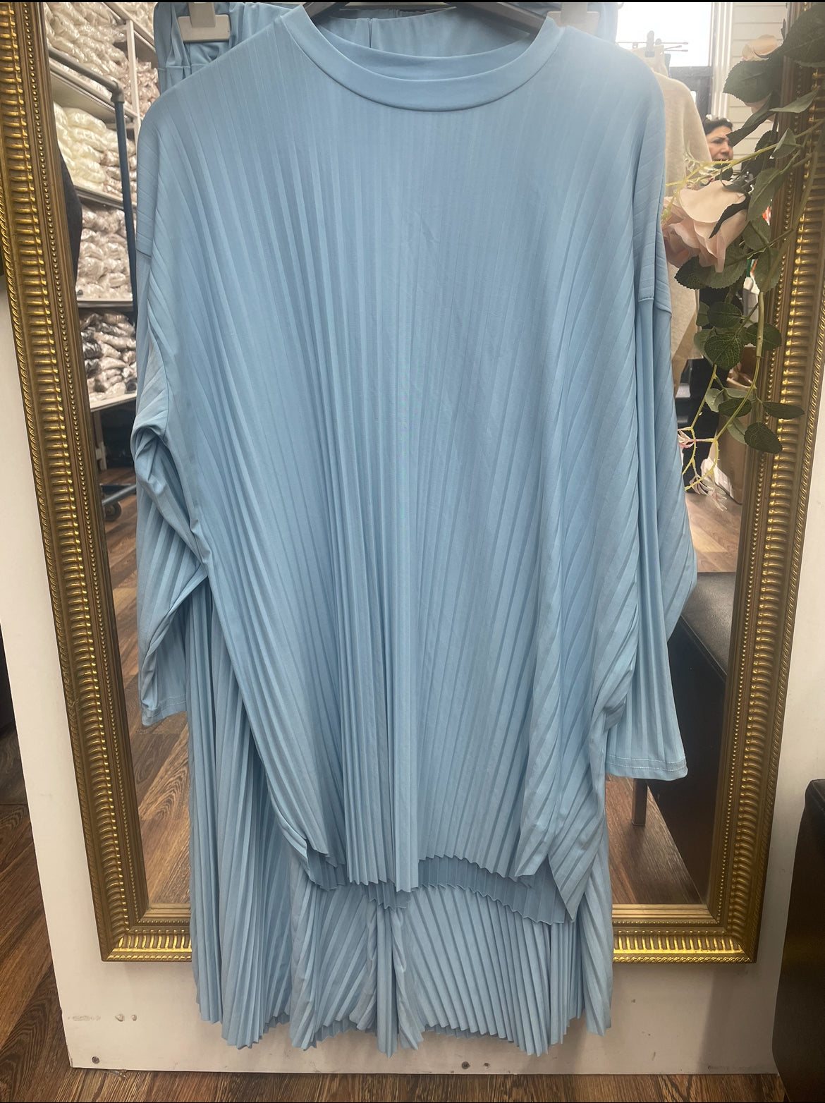 Achieve a simple and chic look with our pleated co-ord set. The set includes a modest top paired with matching flared trousers that are perfect for spring.